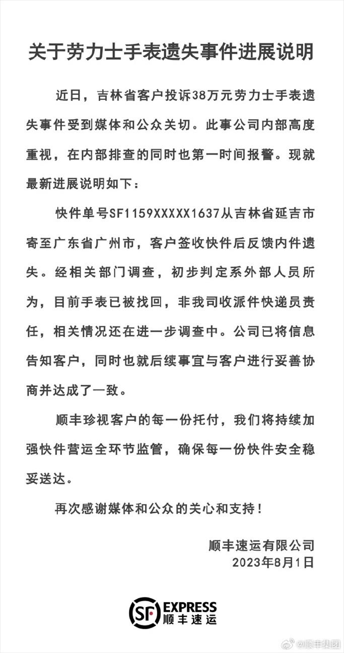 ·順豐速運回應(yīng)38萬勞力士手表遺失事件:初判系外部人員所為。