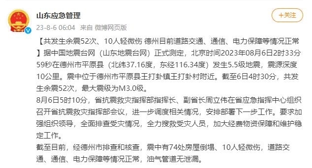 截至目前,經(jīng)德州市排查和核查,震中有74處房屋倒塌、10人輕微傷,道路交通、通信、電力保障等情況正常,油氣管道無泄漏。