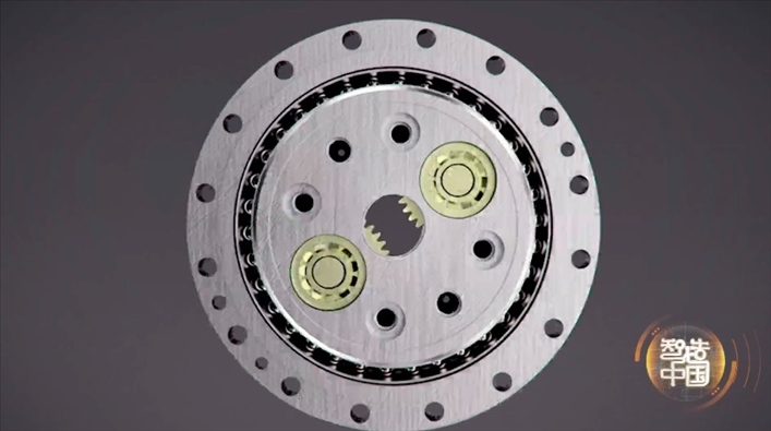 打開RV減速機,里面就像一個太陽系,既有太陽輪,也有行星輪。這就是RV減速機的擺線行星輪,它們就像圍繞太陽的行星,既有自轉也有公轉,自轉一圈的同時公轉40圈,通過多組行星運動實現(xiàn)精密傳動,把電機的高速轉動降下來,同時增大轉矩,驅動機器人手臂旋轉。