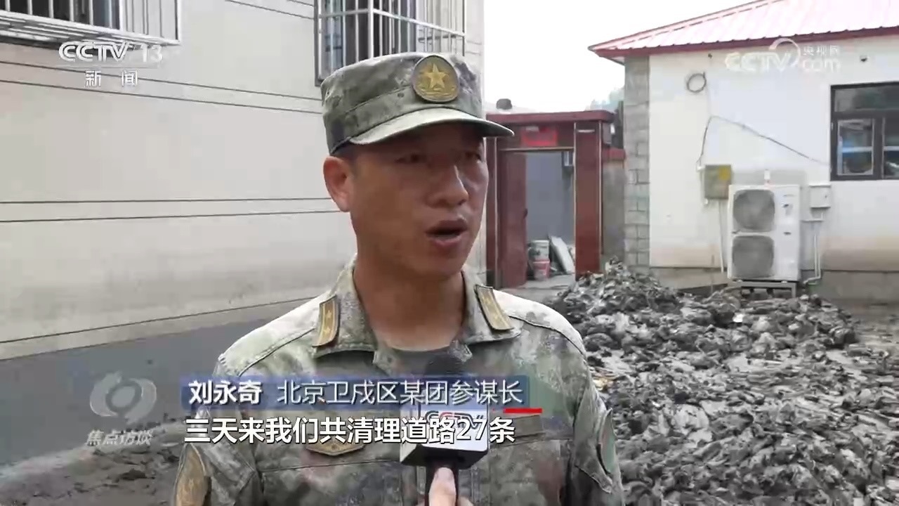 北京衛(wèi)戍區(qū)某團(tuán)參謀長(zhǎng)劉永奇:“三天來(lái),我們共清理道路27條,面積28000余平方米,淤泥700余立方米,廢舊垃圾1300余立方米,全面疏通了各條道路?!?/p>