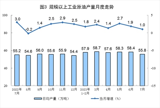 原油產(chǎn)量小幅增加,進(jìn)口保持較快增長。7月份,生產(chǎn)原油1731萬噸,同比增長1.0%,增速比6月份放緩0.9個百分點(diǎn),日均產(chǎn)量55.8萬噸。進(jìn)口原油4369萬噸,同比增長17.0%,增速比6月份回落28.4個百分點(diǎn)。