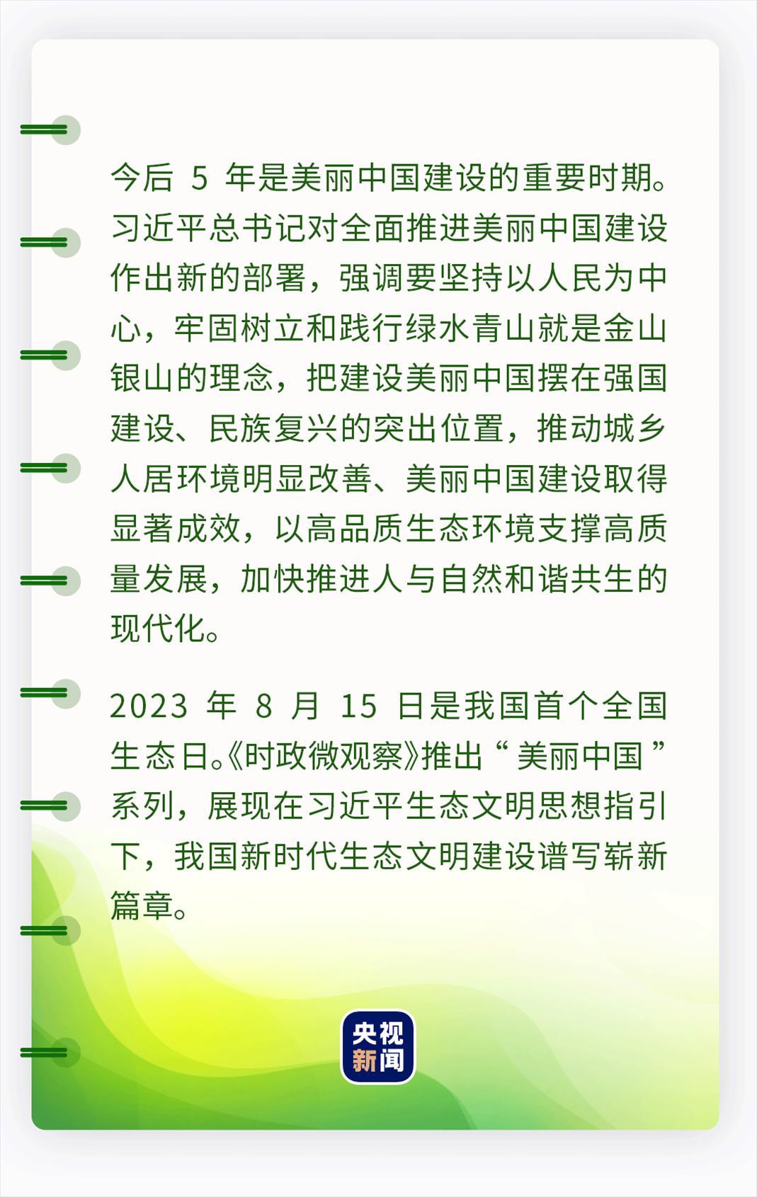 習(xí)近平希望全社會(huì)行動(dòng)起來(lái),做綠水青山就是金山銀山理念的積極傳播者和模范踐行者,身體力行、久久為功,為共建清潔美麗世界作出更大貢獻(xiàn)。