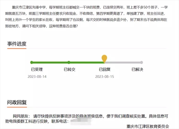 ·重慶江津某中學(xué)一班級收5萬元班費,每人一學(xué)期交1000元。區(qū)教委:已啟動調(diào)查程序,督促學(xué)校自查。