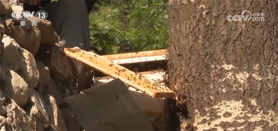 在暴雨災害中,泗馬溝村的中華蜂養(yǎng)殖場的一些蜂箱進水,蜂王帶著蜂群飛到附近的樹洞里或樹杈上。蜂農(nóng)們用煙熏的方式將蜜蜂從樹洞中熏出來,再用巢脾將它們誘接回養(yǎng)殖蜂箱內(nèi)。目前,絕大部分被暴雨沖散的蜂群已被找回。