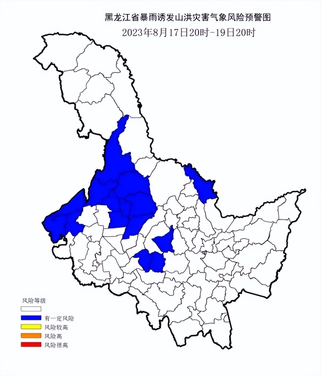 黑龍江省防汛抗旱指揮部辦公室、黑龍江省水利廳、黑龍江省氣象局8月17日20時聯(lián)合發(fā)布藍色山洪災(zāi)害氣象風險預警:?