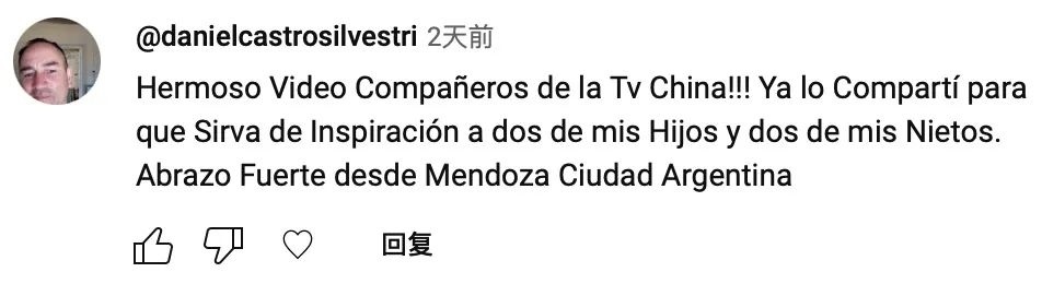 網(wǎng)友danielcastrosilvestri:“中國電視臺的朋友們,這個視頻太好看了!?。∥野阉窒沓鋈?,希望它能夠給我的兩個孩子和兩個孫子帶來啟發(fā)。我來自阿根廷的門多薩市,致禮?!?/p>