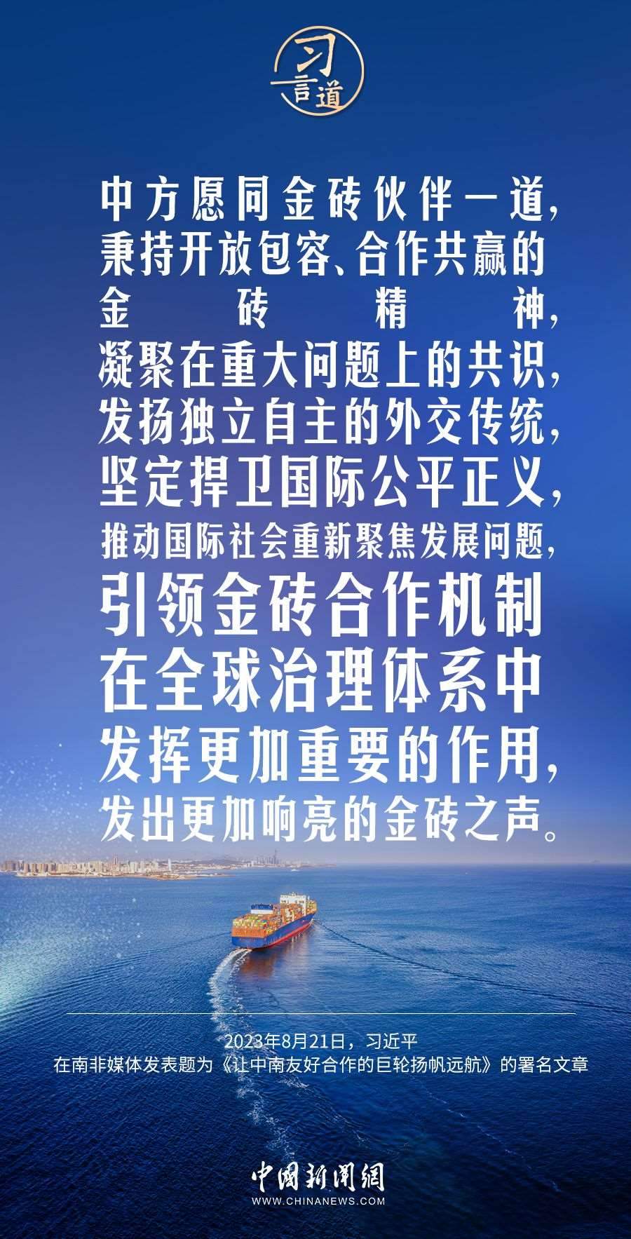 8月21日,在赴約翰內斯堡出席金磚國家領導人第十五次會晤并對南非進行國事訪問之際,國家主席習近平在南非《星報》、《開普時報》、《水星報》和南非獨立媒體網站發(fā)表題為《讓中南友好合作的巨輪揚帆遠航》的署名文章。習近平指出——