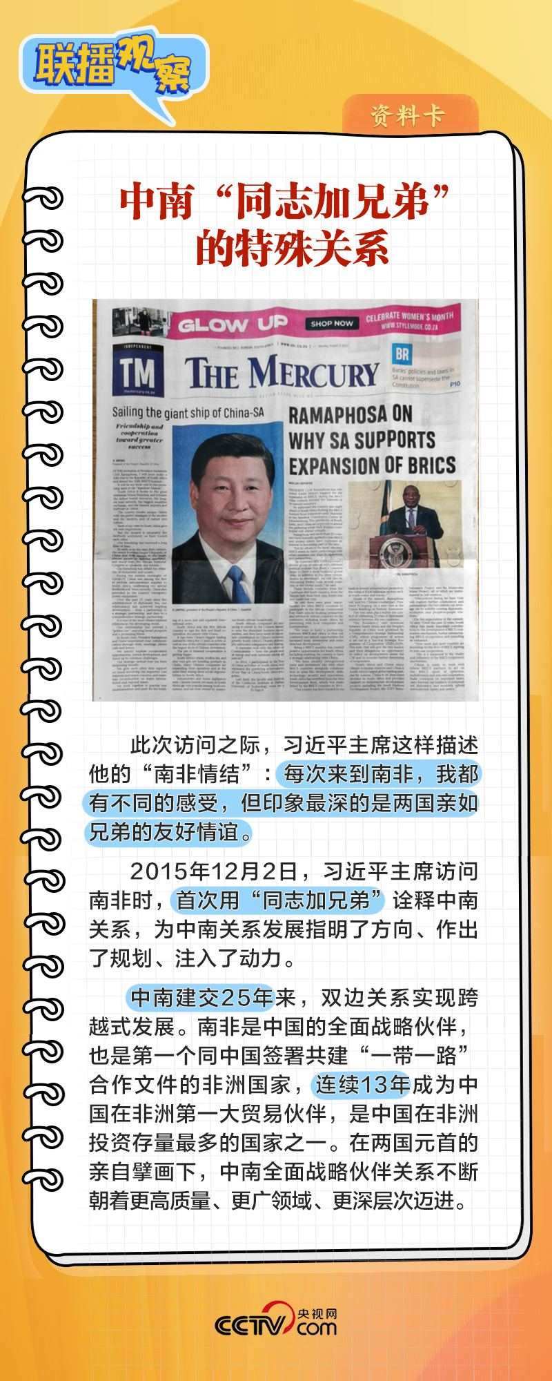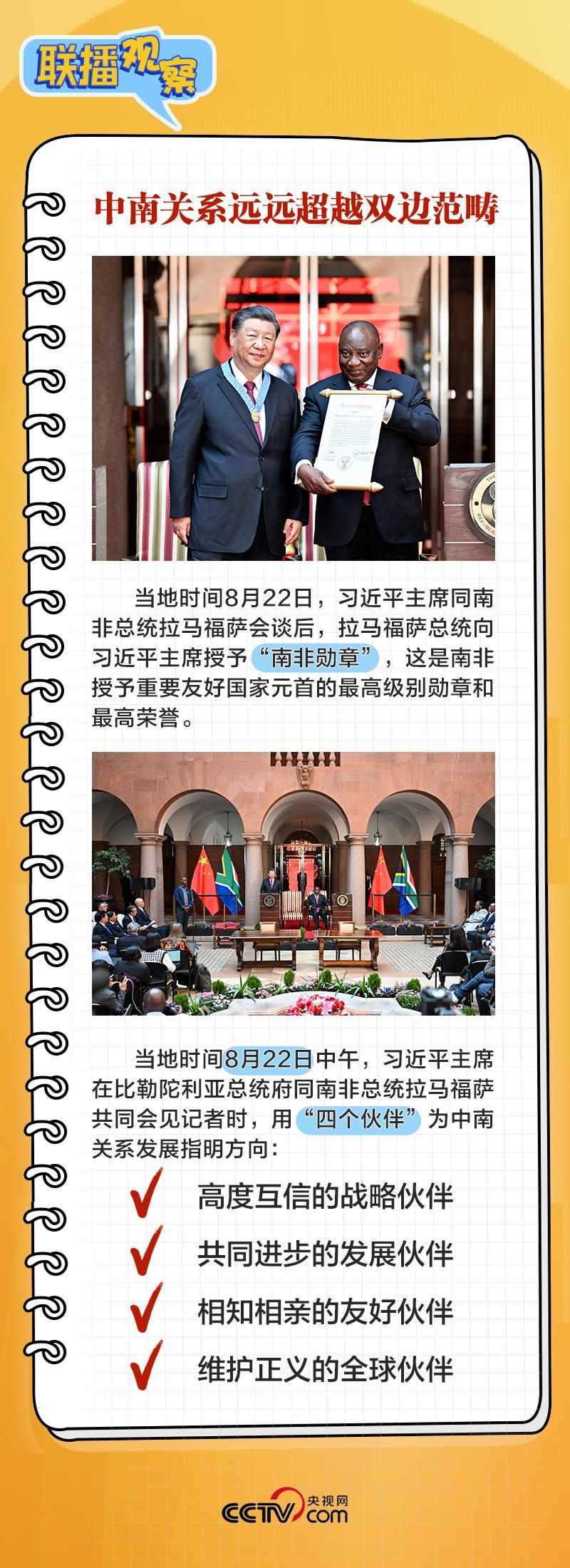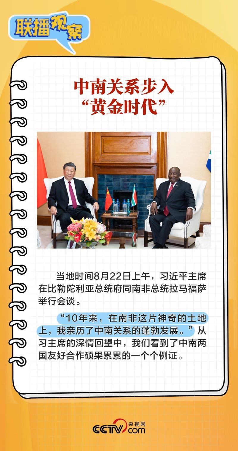 8月22日上午,在同南非總統(tǒng)拉馬福薩舉行會談時,習(xí)主席表示:“中南關(guān)系之所以好、中南友誼之所以深,關(guān)鍵在于兩國兩黨在各自發(fā)展道路上休戚與共,結(jié)下了同志加兄弟的深厚友誼。”