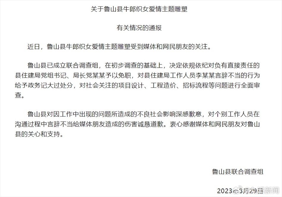 ·魯山縣通報(bào)花700多萬(wàn)建牛郎織女雕塑:縣住建局局長(zhǎng)免職,罵記者的工作人員記大過(guò)。
