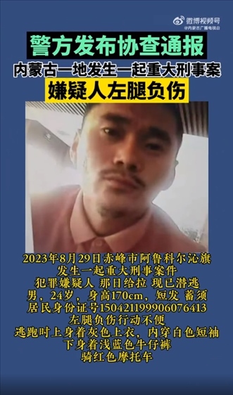·內(nèi)蒙古赤峰市發(fā)生一起重大刑事案件,警方發(fā)布協(xié)查通報(bào)。