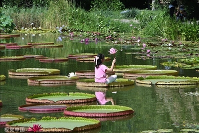 北京,國(guó)家植物園南園,公園舉辦王蓮承載小孩的活動(dòng)。