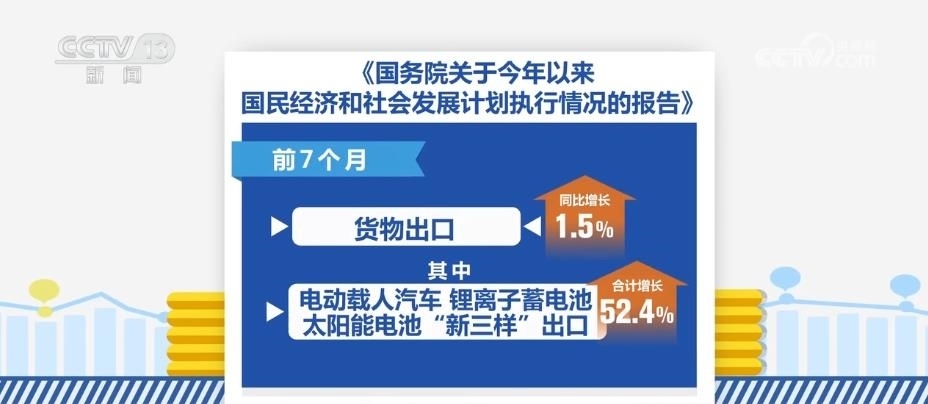 前7個(gè)月,貨物出口同比增長(zhǎng)1.5%,其中,電動(dòng)載人汽車、鋰離子蓄電池、太陽(yáng)能電池“新三樣”出口合計(jì)增長(zhǎng)52.4%。