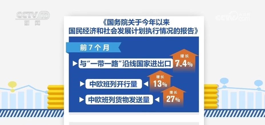 報(bào)告顯示,共建“一帶一路”持續(xù)推進(jìn)。鞏固拓展與重點(diǎn)共建國(guó)家和國(guó)際組織的務(wù)實(shí)合作,進(jìn)一步強(qiáng)化風(fēng)險(xiǎn)防控,前7個(gè)月與“一帶一路”沿線國(guó)家進(jìn)出口增長(zhǎng)7.4%,中歐班列開(kāi)行量、貨物發(fā)送量分別增長(zhǎng)13%、27%。