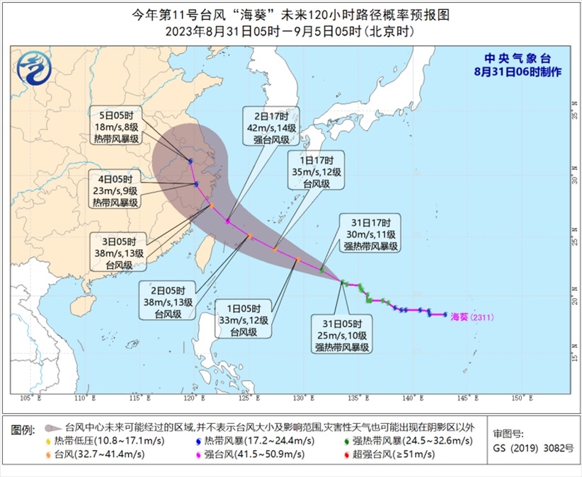 預(yù)計(jì),“蘇拉”將以每小時(shí)10公里左右的速度向西北方向移動(dòng),逐漸向廣東東部一帶沿??拷?,強(qiáng)度緩慢減弱,并將于9月1日下午至夜間在廣東惠來(lái)到香港一帶沿海登陸(強(qiáng)臺(tái)風(fēng)級(jí)或超強(qiáng)臺(tái)風(fēng)級(jí),45~52米/秒,14~16級(jí)),也有可能在廣東東部近岸海面向西偏南方向移動(dòng)。中央氣象臺(tái)今晨升級(jí)發(fā)布臺(tái)風(fēng)紅色預(yù)警。