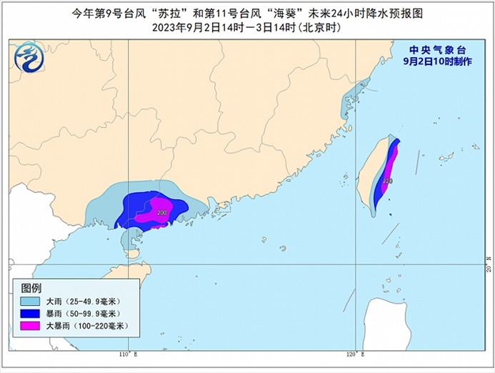 降水預(yù)報:9月2日14時至3日14時,受“蘇拉”和“??庇绊懀瑥V東西南部、廣西東南部、福建東北部沿海、臺灣島東部等地有大到暴雨,其中,廣東西南部、臺灣島東部等地部分地區(qū)有大暴雨(100~220毫米)。