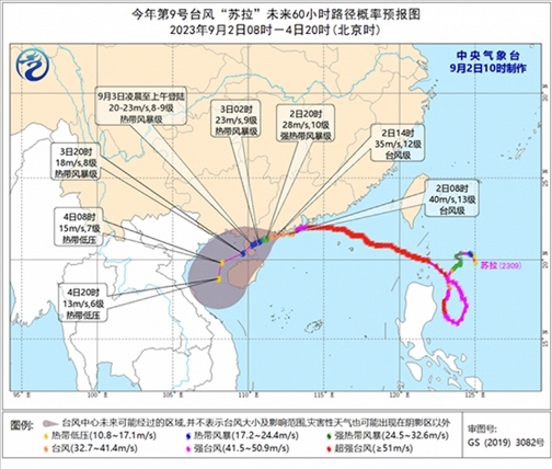 另外,今年第9號臺風(fēng)“蘇拉”的中心今天(9月2日)上午8點鐘位于廣東省臺山市近海,就是北緯21.6度、東經(jīng)112.7度,中心附近最大風(fēng)力有13級(40米/秒),中心最低氣壓為960百帕。