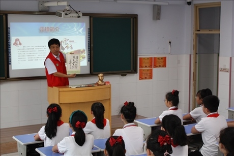 9月1日,陳奇峰為河北省衡水市慶豐街小學(xué)的學(xué)生們講述雷鋒故事。(趙棟 攝)