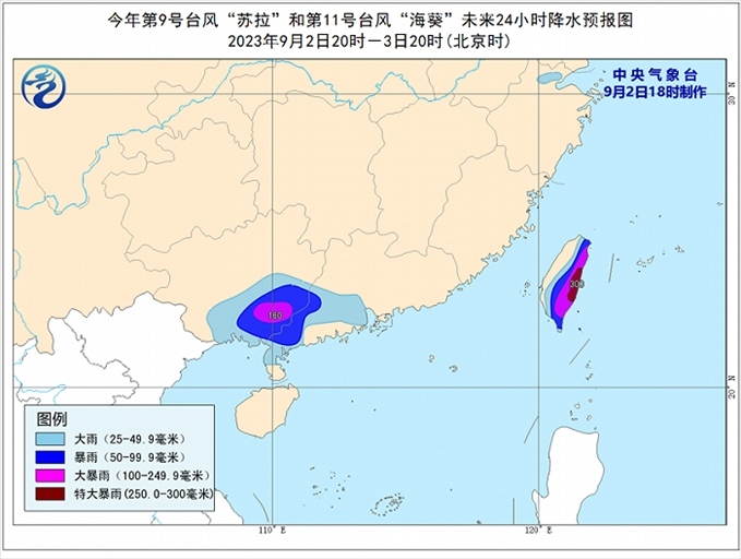 降水預(yù)報(bào): 9月2日20時(shí)至3日20時(shí),受“蘇拉”和“??庇绊懀瑥V西中南部、廣東西南部、臺(tái)灣島大部有大到暴雨,其中,廣西東南部、臺(tái)灣島東部等地部分地區(qū)有大暴雨,臺(tái)灣島東部局地有特大暴雨(250-300毫米)。