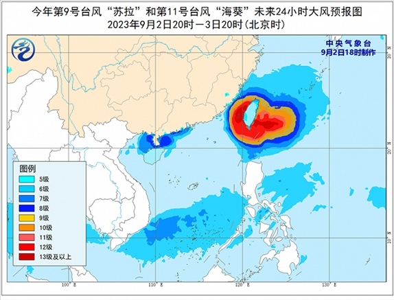 大風(fēng)預(yù)報(bào):9月2日20時(shí)至3日20時(shí),受“蘇拉”影響,廣東中西部沿海、廣西南部沿海、海南島北部沿海、珠江口及澳門(mén)等地將有6-7級(jí)大風(fēng),南海西北部、北部灣東部和瓊州海峽將有8級(jí)、陣風(fēng)9-10級(jí)的大風(fēng);受“??庇绊?,巴士海峽南部、臺(tái)灣海峽西部、東海南部及釣魚(yú)島附近海域、浙江南部沿海、福建中北部沿海、臺(tái)灣島沿海將有6-8級(jí)、陣風(fēng)9-10級(jí)大風(fēng),巴士海峽北部、臺(tái)灣海峽東部、臺(tái)灣以東洋面及臺(tái)灣島南部沿海的風(fēng)力有9-12級(jí),陣風(fēng)13-14級(jí),“??敝行慕?jīng)過(guò)的附近海面或地區(qū)的風(fēng)力有13-16級(jí),陣風(fēng)17級(jí)。
