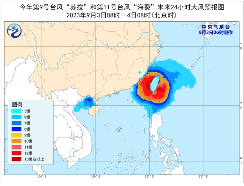 大風(fēng)預(yù)報(bào):9月3日08時(shí)至4日08時(shí),受“蘇拉”影響,北部灣、瓊州海峽以及廣西南部沿海、海南島北部沿海等地將有6-7級(jí)大風(fēng),其中北部灣部分海域?qū)⒂?級(jí)、陣風(fēng)9-10級(jí)的大風(fēng);受“??庇绊懀褪亢{、臺(tái)灣海峽、臺(tái)灣以東洋面、東海南部及釣魚(yú)島附近海域以及浙江南部沿海、福建沿海、臺(tái)灣島沿海將有6-8級(jí)、陣風(fēng)9-10級(jí)大風(fēng),部分海域或地區(qū)的風(fēng)力有9-12級(jí),陣風(fēng)13-14級(jí),“海葵”中心經(jīng)過(guò)的附近海面或地區(qū)的風(fēng)力有13-16級(jí),陣風(fēng)17級(jí)。