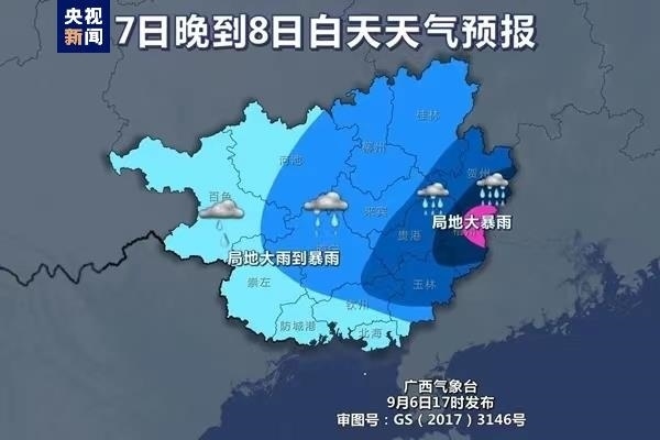 7日晚上到8日白天,賀州、梧州、貴港等市和桂林南部、來賓東部、玉林北部有大雨到暴雨、局地大暴雨,廣西其他地區(qū)有小到中雨、局地大雨到暴雨。