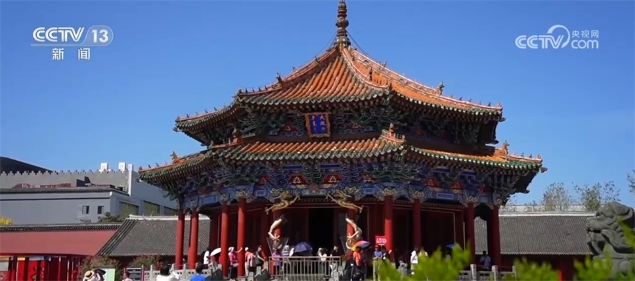 總臺記者 楊雪:來沈陽故宮參觀,和標志性建筑大政殿合個影是必不可少的。建于1625—1626年的大政殿,是沈陽故宮中營建時間最早的一組建筑。大政殿是當時舉行大型活動和慶典的地方。在大政殿的正對面,十王亭成雁翅形排開,是當時官員處理政務(wù)的地方。這11座亭子其實也是11座帳篷的化身,帳篷是移動遷移的,而亭子是固定下來了,這種帳殿式的建筑風格也表現(xiàn)民族文化發(fā)展的歷程。
