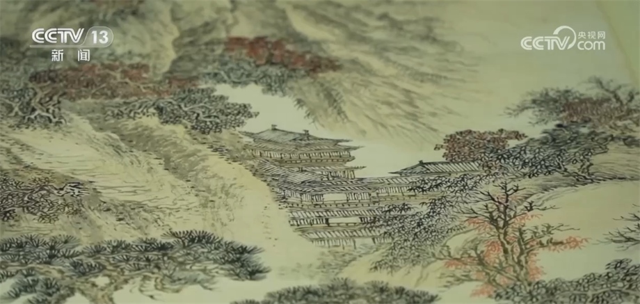 這幅《秋林書屋圖》,是清初四王之一、非常著名的畫家王翚在79歲的時候創(chuàng)作的,是珍貴的國家一級文物。這幅畫呈現(xiàn)的就是文人在山中茅屋當中讀書的一個情景。雖然300多年的時間過去了,但是展開這幅畫,我們?nèi)匀豢梢钥吹椒浅ur明的色彩,蒼林翠竹與霜葉秋楓交相輝映,給我們帶來非常美的視覺享受。