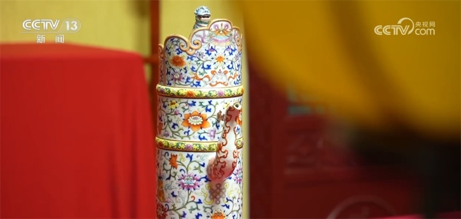 總臺記者 楊雪:沈陽故宮當中的很多珍貴院藏文物都見證了多民族文化融合的過程,像我們眼前看到的這款清乾隆款粉彩多穆壺就是其中之一。多穆在藏語當中是奶茶桶的意思,直到現(xiàn)在,像銅制、木制、皮質(zhì)的很多多穆壺仍然被蒙、藏等少數(shù)民族沿襲使用著。大家可以看到,這款多穆壺的蓋子上蹲坐著一只非常靈動的小獅子,有祈福和護佑主人的意思。這件多穆壺是國家一級文物,距今已經(jīng)有200多年的歷史了。