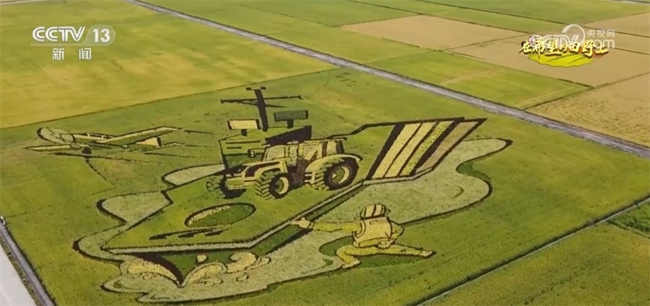 總臺央視記者 蔣樹林:金秋9月的稻田是什么顏色的?9月的稻香又是什么味道?來這里,有可能會找到您想要的答案。我現(xiàn)在是在黑龍江北大荒閆家崗農(nóng)場。大家來看,這個稻田觀景臺有十多米高,因此站在這里,秋日稻田大片的圖案映入眼簾,今年稻田畫以“鄉(xiāng)村振興”“數(shù)字農(nóng)業(yè)”為主題,生動展現(xiàn)了“讓農(nóng)業(yè)更美好、讓農(nóng)民更幸?!钡拿篮迷妇啊5咎锂嬍寝r(nóng)民們勤勞與智慧的展現(xiàn),他們用稻田畫為家鄉(xiāng)水稻代言,而對于在黑土地打拼的北大荒人而言,還有更重要的意義。