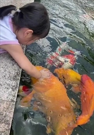 ·5歲女孩池邊喂50斤胖錦鯉小月餅:錦鯉天然更親近小朋友。