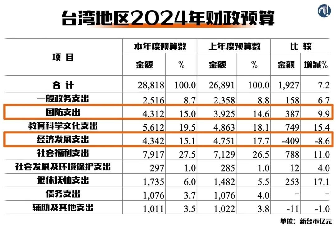民進(jìn)黨當(dāng)局不久前通過的2024年財政預(yù)算案就很能說明問題。各項支出中,防務(wù)支出繼續(xù)保持增長,經(jīng)濟發(fā)展支出卻是所有領(lǐng)域中跌幅最大的。