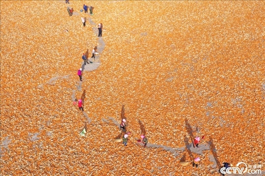 甘肅省張掖市,玉米種子喜獲豐收,晾曬場(chǎng)上一片金黃。