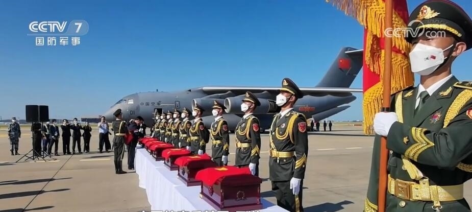 空軍航空兵某團 孟洋:當(dāng)時在儀式的現(xiàn)場,我們機組成員是列隊在飛機的后艙位置,準(zhǔn)備迎接烈士遺骸上飛機。當(dāng)儀仗隊隊員緩緩地將棺槨搬上飛機的那一刻,我看著一面面國旗覆蓋在棺槨上,直到那一刻,我才更加深刻地理解我們國旗的顏色是由無數(shù)革命先烈鮮血染成的。