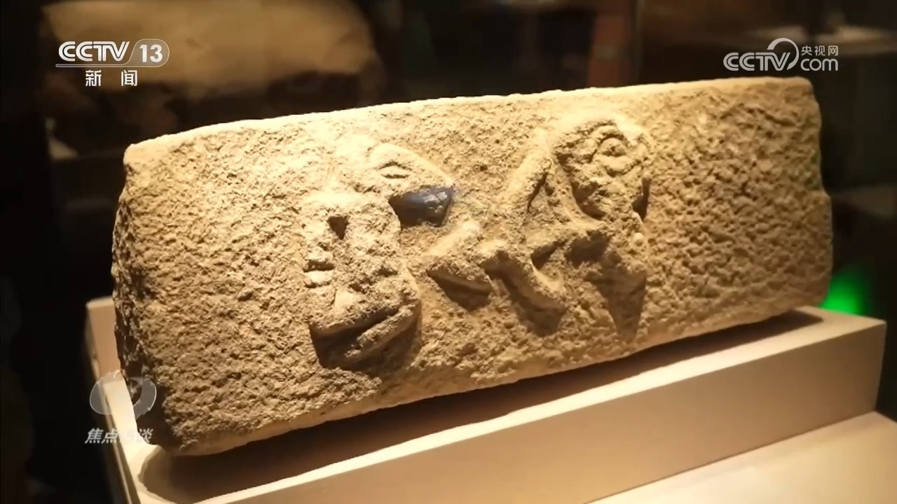 龜甲出土于河南省漯河市舞陽縣賈湖遺址,當時遺址內(nèi)發(fā)現(xiàn)17例刻在龜甲、骨器上的符號,內(nèi)容都與占卜相關(guān),被稱為賈湖刻符。符號圖畫為我們揭開了祖先們當時的生活圖景?!叭松漶R石雕”出土于陜西榆林神木市石峁遺址,在距今約4000年前,先人們以浮雕的方式成圖,一人持弓箭射馬,弓、弦、箭一樣不少。