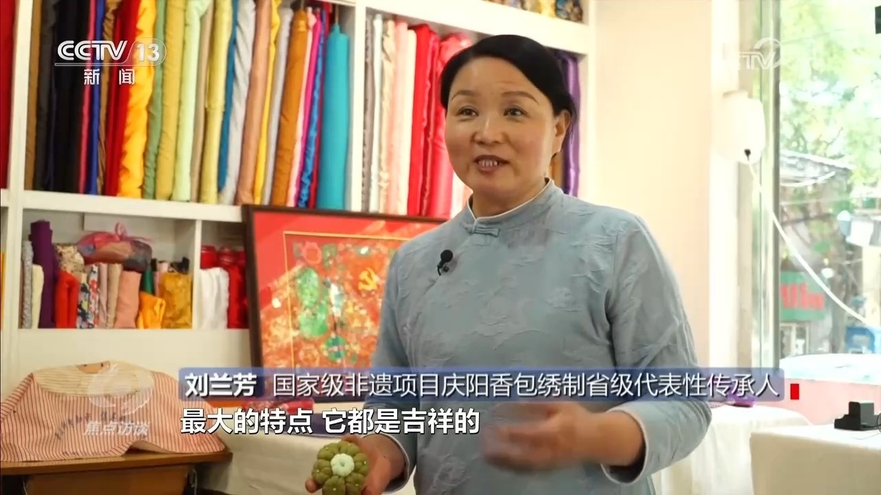 國家級非遺項目慶陽香包繡制省級代表性傳承人劉蘭芳:“這個針法的特點是一根針一根線從頭到尾不能斷頭,要一次完成,而且左右對稱、上下對稱,我們祖祖輩輩傳承到今天?!?/p>