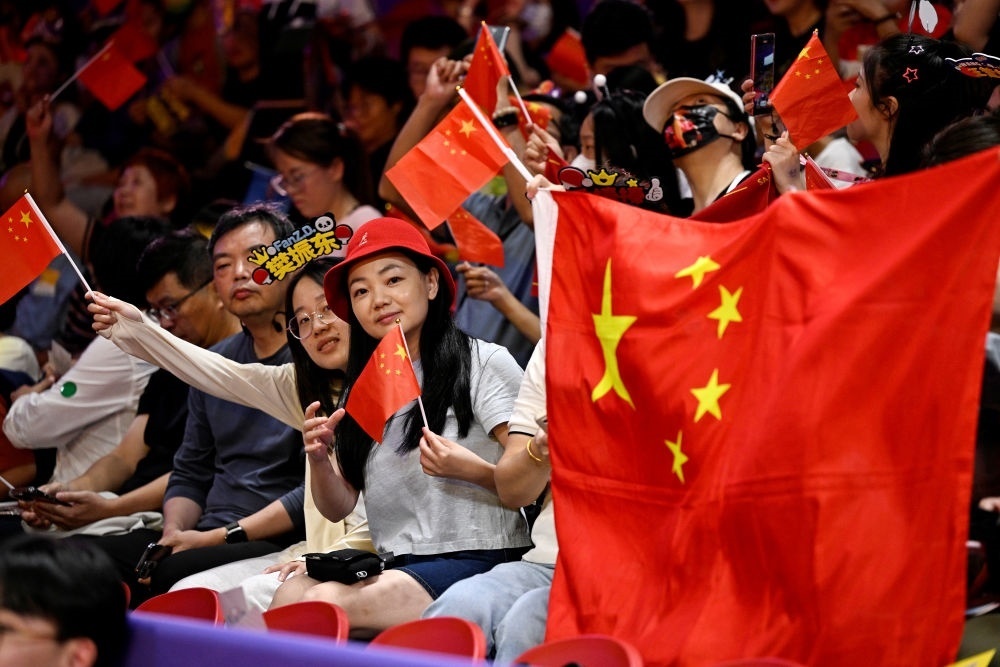 10月1日,觀眾在杭州亞運(yùn)會(huì)乒乓球比賽現(xiàn)場(chǎng)為選手加油。新華社記者 王鵬 攝