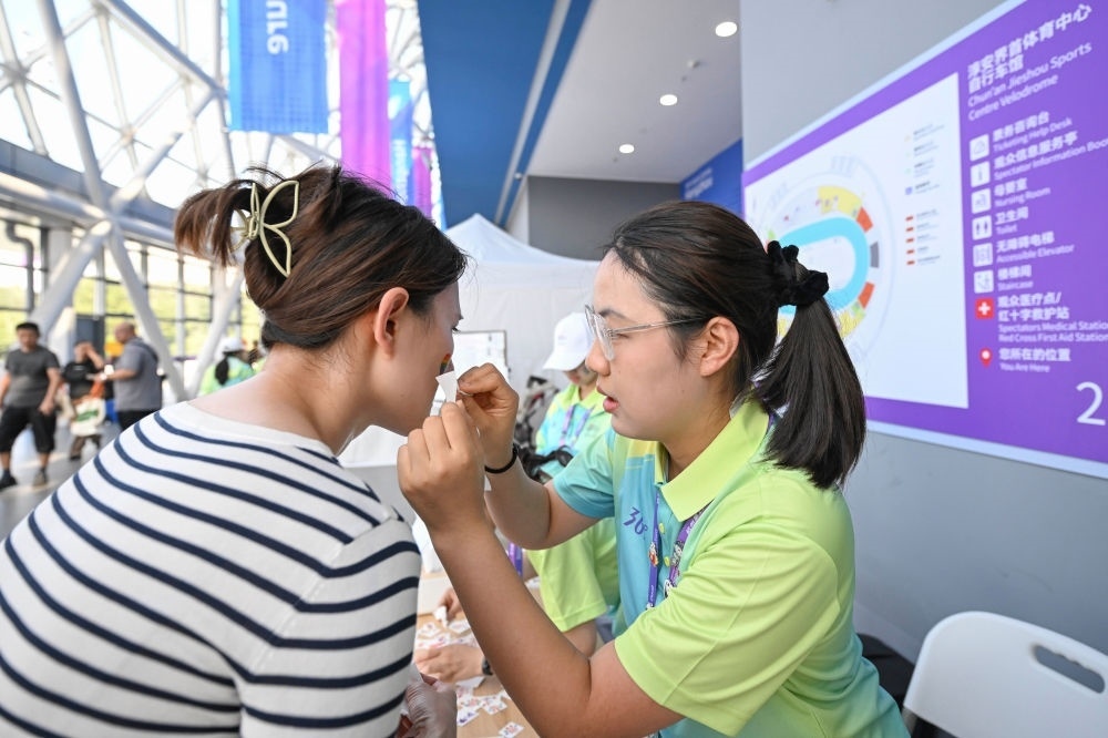 9月26日,浙江杭州淳安界首體育中心自行車館場(chǎng)館志愿者為前來觀賽的觀眾貼上加油助威貼紙。新華社記者 胡虎虎 攝