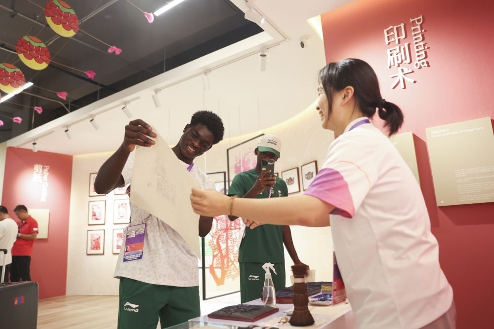 9月29日,沙特阿拉伯運(yùn)動(dòng)員穆罕默德·杜海姆·穆阿維(左)在亞運(yùn)村體驗(yàn)雕版印刷。新華社記者 胡星宇 攝