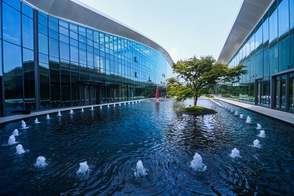 這是杭州富陽(yáng)水上運(yùn)動(dòng)中心的中庭花園(8月24日攝),水池中的水來自于循環(huán)利用的雨水。新華社記者 徐昱 攝