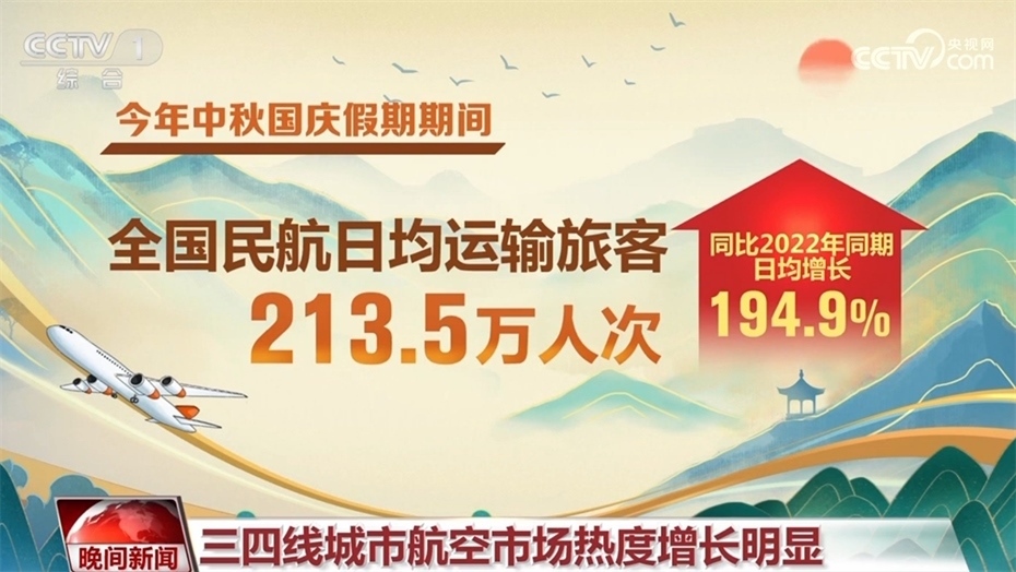 民航方面,今年中秋國慶假期期間,全國民航日均運(yùn)輸旅客213.5萬人次,同比2022年同期日均增長194.9%。除了北京、上海、重慶、三亞等熱門城市航線火爆外,三四線城市的航空市場熱度增長明顯,直接帶動了當(dāng)?shù)氐慕?jīng)濟(jì)。