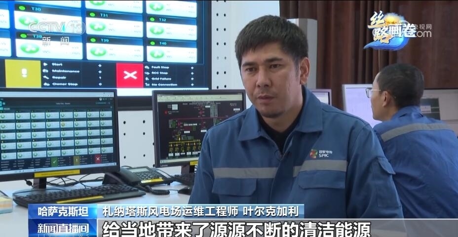 總臺記者 張譽耀:這里就是札納塔斯,哈薩克斯坦最大的風力發(fā)電場之一,像我身后這樣一座風能發(fā)電機能滿足當?shù)丶s4000戶家庭的用電需求,而我身后一共有40座這樣的風能發(fā)電機,也就是說能夠滿足當?shù)?6萬戶家庭的用電需求。正是這一座座轉(zhuǎn)動的風能發(fā)電機,點亮了札納塔斯這座小城的日常生活。
