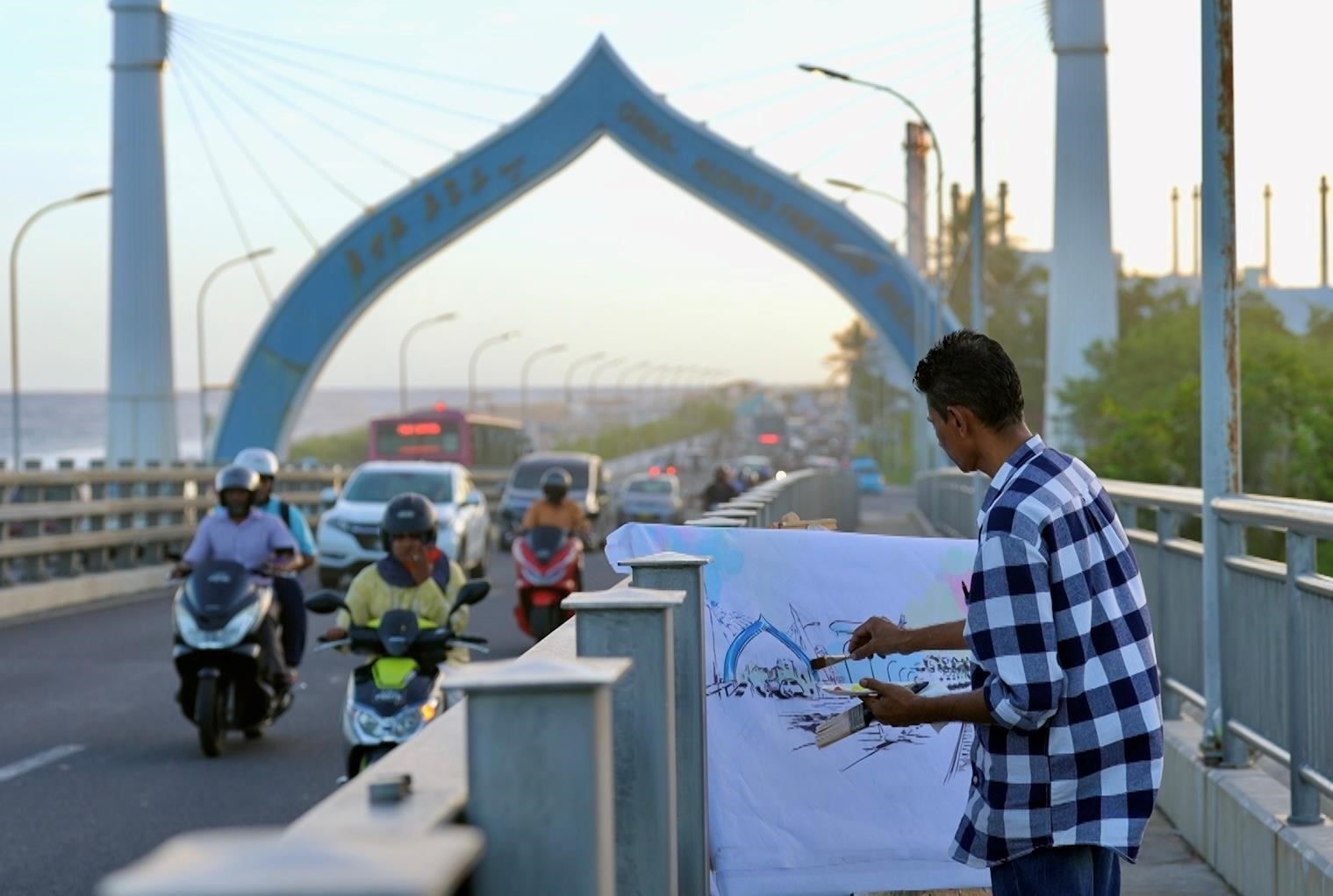 馬爾代夫首都馬累,市中心最熱鬧的花園里,陽(yáng)光在墻面灑下斑駁樹(shù)影,一座大橋跨海而立。這是畫(huà)家阿米爾在2016年創(chuàng)作的一幅大型壁畫(huà)。