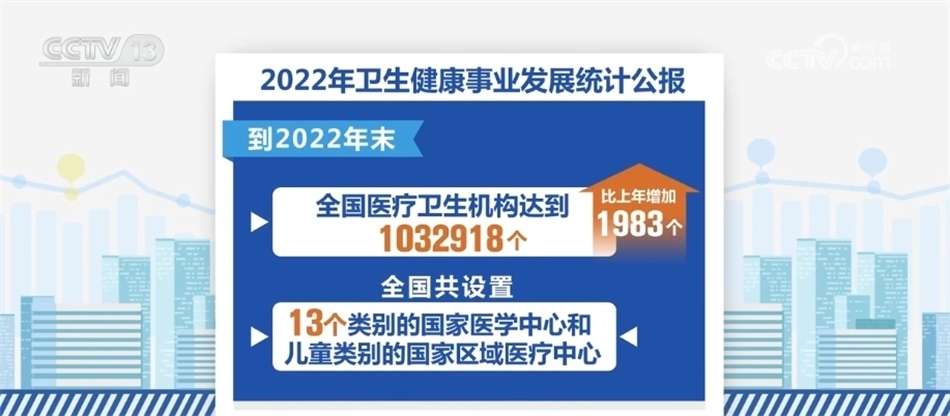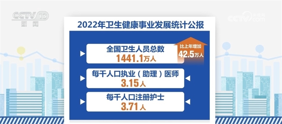 《公報(bào)》顯示,我國(guó)醫(yī)療衛(wèi)生資源總量繼續(xù)增加。到2022年末,全國(guó)醫(yī)療衛(wèi)生機(jī)構(gòu)達(dá)到1032918個(gè),比上年增加1983個(gè)。全國(guó)共設(shè)置13個(gè)類別的國(guó)家醫(yī)學(xué)中心和兒童類別的國(guó)家區(qū)域醫(yī)療中心。全國(guó)醫(yī)療衛(wèi)生機(jī)構(gòu)床位975.0萬(wàn)張,每千人口醫(yī)療衛(wèi)生機(jī)構(gòu)床位數(shù)由2021年的6.70張?jiān)黾拥?022年的6.92張。全國(guó)衛(wèi)生人員總數(shù)1441.1萬(wàn)人,比上年增加42.5萬(wàn)人。每千人口執(zhí)業(yè)(助理)醫(yī)師3.15人,每千人口注冊(cè)護(hù)士3.71人。