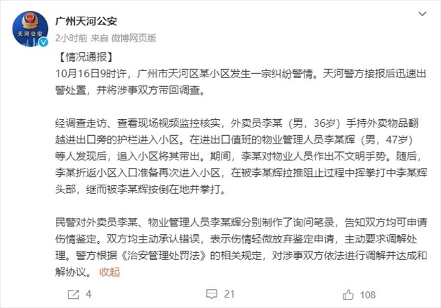 ·廣州警方通報(bào)小區(qū)保安將外賣員按地上毆打:雙方均主動承認(rèn)錯誤,已達(dá)成和解協(xié)議。