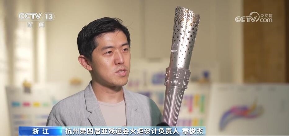 杭州第四屆亞殘運(yùn)會(huì)火炬設(shè)計(jì)負(fù)責(zé)人 章俊杰:玉琮是實(shí)證中華五千年(文明史)的良渚(遺址)文明當(dāng)中的一個(gè)重要禮器,我們把玉琮作為核心意象,外方內(nèi)圓,我們?cè)谂e起火炬的時(shí)候,所有人的視覺焦點(diǎn)玉琮它承上啟下,分別代表了不同的寓意。承上,我們用點(diǎn)點(diǎn)的星光匯聚成桂花桂冠,可以看到星光越來(lái)越稠密,這是我們希望體現(xiàn)整個(gè)火炬設(shè)計(jì)的積極向上的那種力量感;玉琮往下,在這個(gè)地方設(shè)計(jì)有幾十條的科技線,它就好像是綿延著人類的歷史和城市科技的脈絡(luò)。
