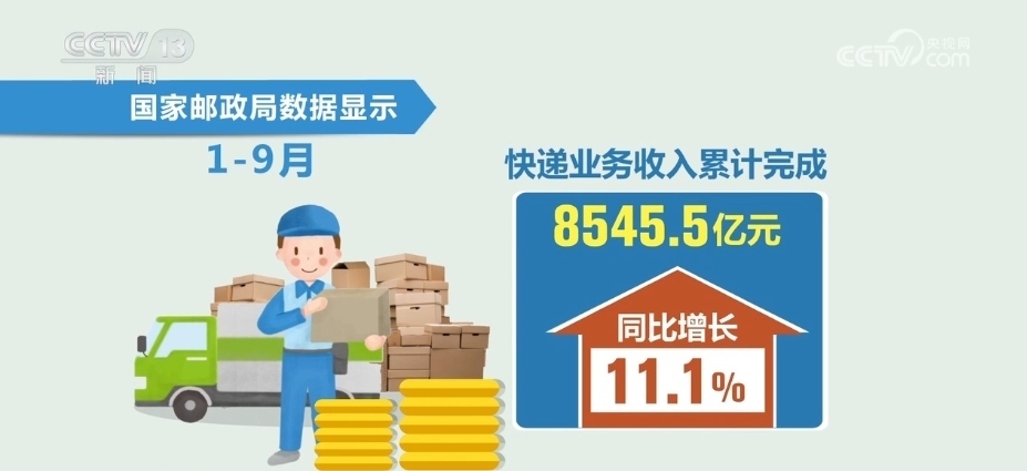 此外,1—9月,全國郵政行業(yè)業(yè)務(wù)收入(不包括郵政儲(chǔ)蓄銀行直接營業(yè)收入)累計(jì)完成11013.3億元,同比增長(zhǎng)10.7%。其中,快遞業(yè)務(wù)收入累計(jì)完成8545.5億元,同比增長(zhǎng)11.1%。