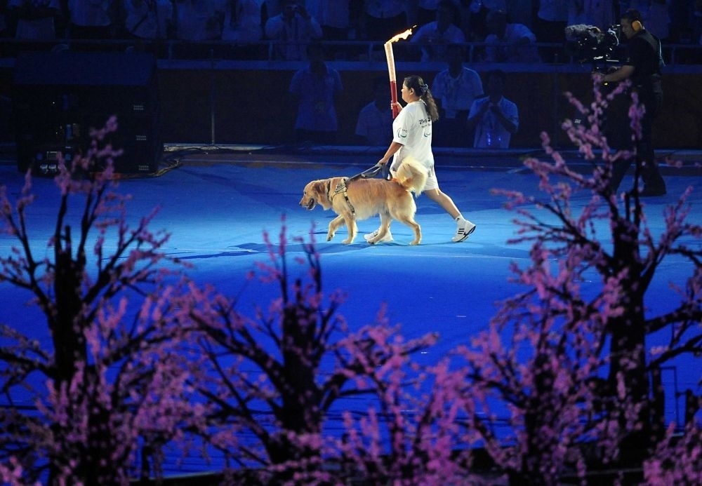 2008年9月6日,北京2008年殘奧會(huì)開(kāi)幕式在國(guó)家體育場(chǎng)隆重舉行,火炬手平亞麗在進(jìn)行火炬?zhèn)鬟f。新華社記者王頌攝