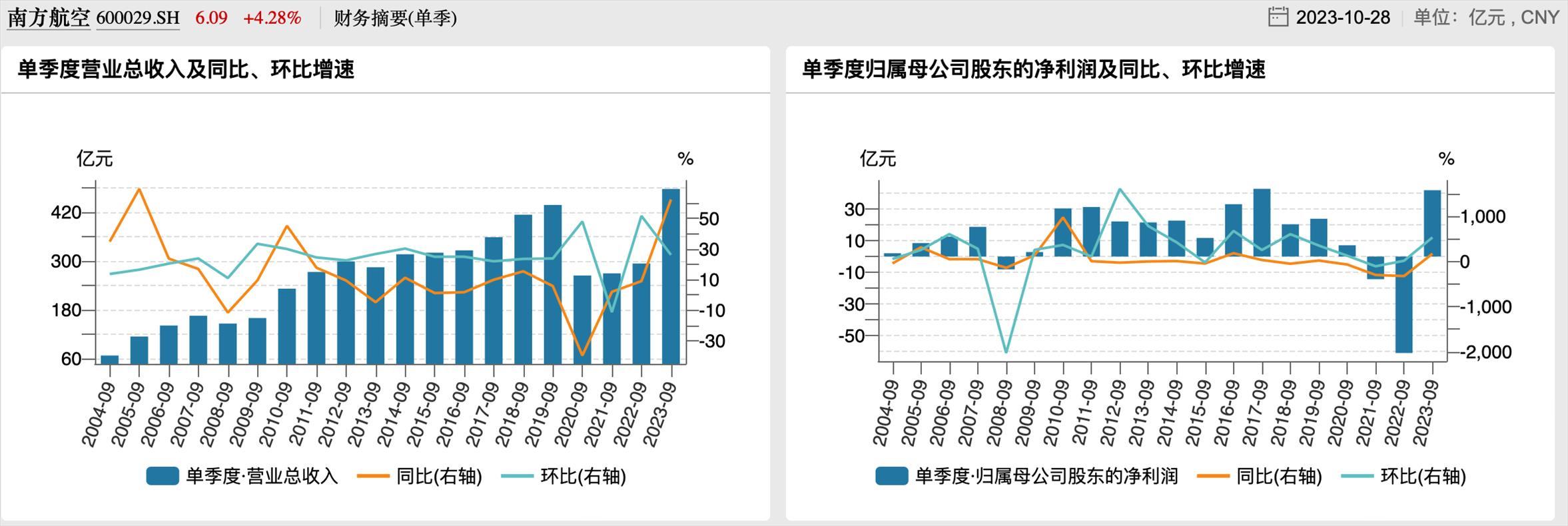 南航三季度和前三季度營收創(chuàng)歷史同期新高,單季凈利潤僅次于2017年水平。前三季度實現(xiàn)同比扭虧,但不及疫情前水平。