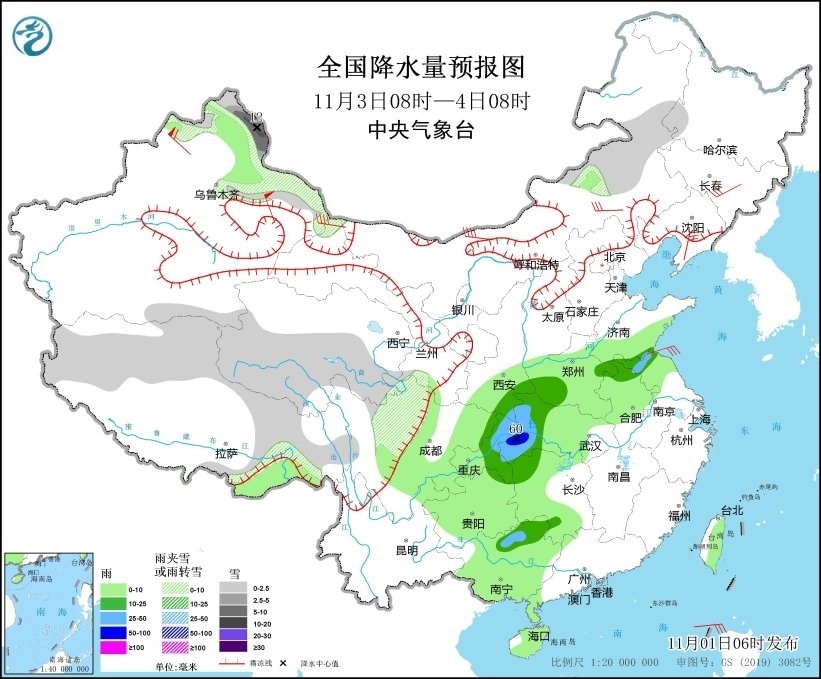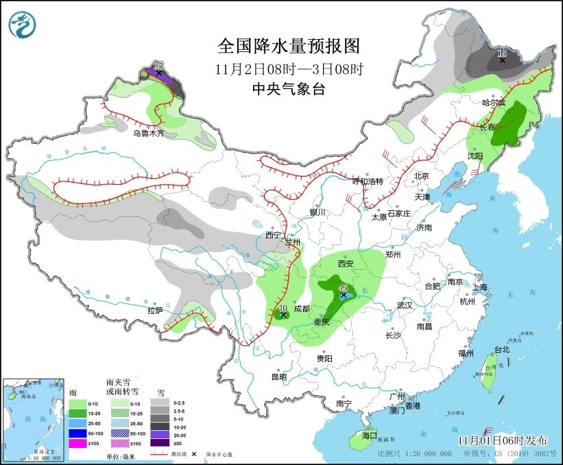 11月2日08時至3日08時,內蒙古東部、黑龍江中北部、新疆北部和南疆盆地南部、西藏北部和東部、青海南部、甘肅西南部等地部分地區(qū)有小到中雪或雨夾雪,其中,新疆阿勒泰北部、黑龍江西北部等地部分地區(qū)有大到暴雪,局地大暴雪(20~25毫米);黑龍江東部、吉林中東部、遼寧北部、陜西南部、四川中東部、重慶、貴州北部、湖北西部、河南西部、海南島、臺灣島等地部分地區(qū)有小到中雨,其中,四川中部、重慶東北部等地局地有大雨(25~45毫米)。內蒙古中東部、吉林中部、遼寧東部、陜西北部等地部分地區(qū)有5~6級風(見圖2)。