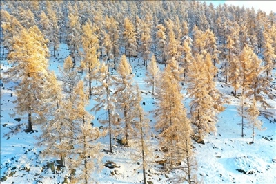 2023年10月31日,新疆阿勒泰地區(qū),滿樹黃葉,白雪覆蓋大地。